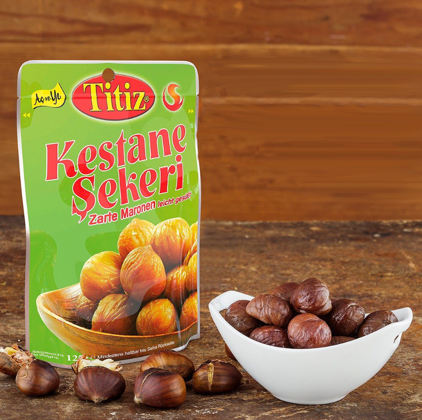 Obrane, uprażone kasztany w słodkiej glazurze od Titiz to pyszna przekąska gotowa do spożycia.To nie tylko uczta dla podniebienia, ale także prawdziwa bomba odżywcza. Kasztany są naturalnym źródłem witaminy B, mają niską zawartość tłuszczu, są wegańskie i bezglutenowe.