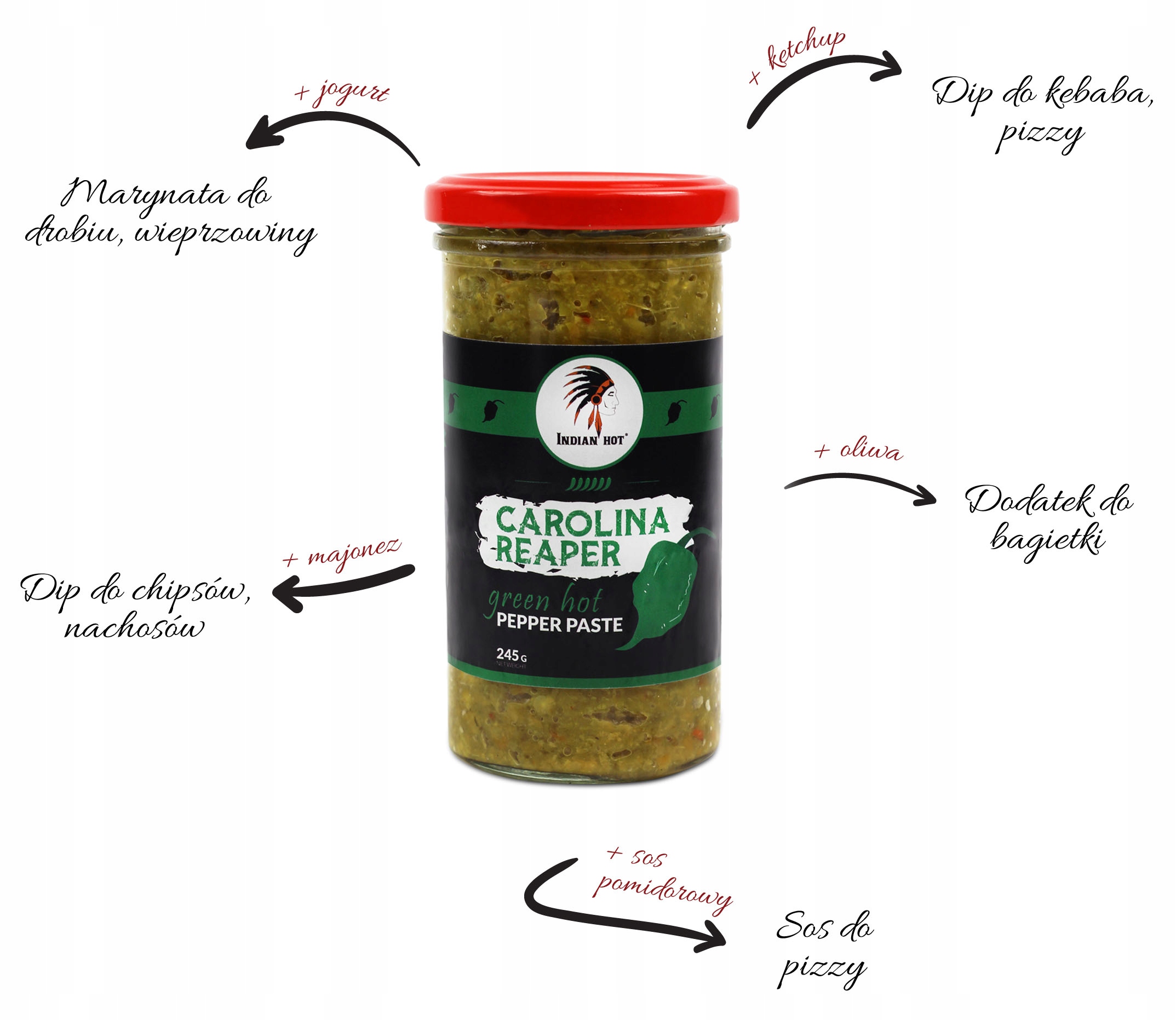 W tej wersji do wyprodukowania pasty , papryczki Caroliina Reaper zostały zerwane gdy były jeszcze zielone, ale dalej niesamowicie pikatne. Koniecznie wypróbuj ten smak!